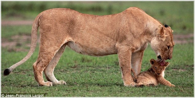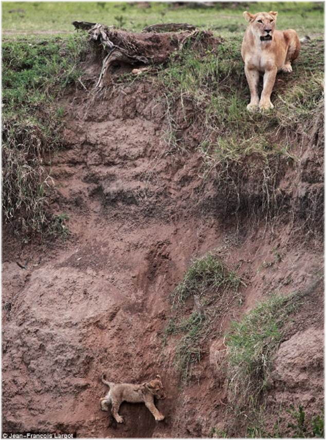 His mother arrives at the edge of the precipice with three other lionesses and a male. The females start to clamber down together but turn back daunted by the sheer drop. Eventually one single factor determines which of them will risk her life to save the youngster -motherly love.