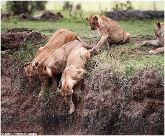 On the brink: Four lionesses look over the edge before aborting their rescue mission because of the sheer drop