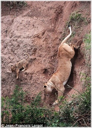 Slowly, agonizingly, the big cat edges her way down towards her terrified son, using her powerful claws to grip the crumbling cliff side.